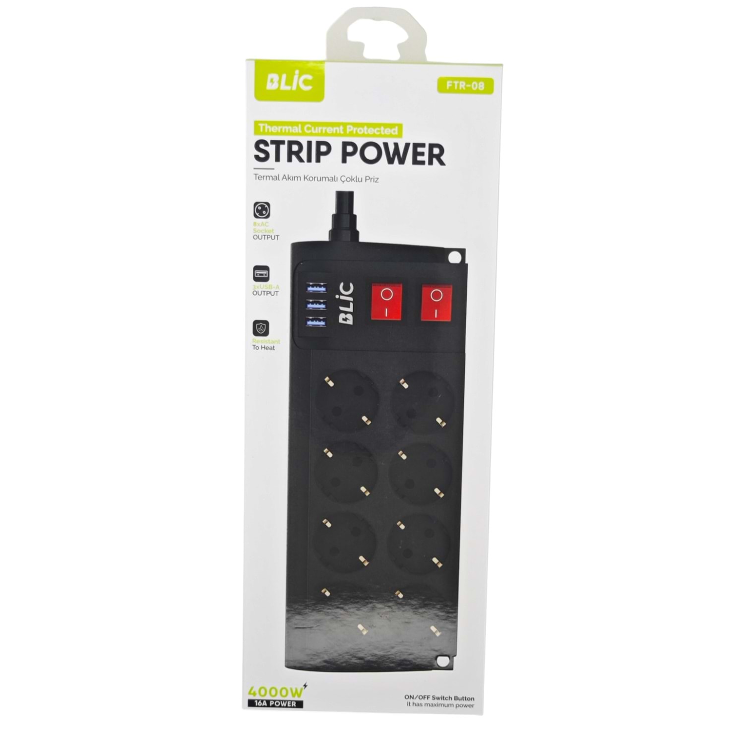 FTR-08 Fulltech 16A Akım Korumalı 3*USB+8li Priz